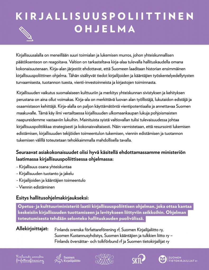 Kirjailijaliiton hallitusohjelmatavoitteet 2023–2027